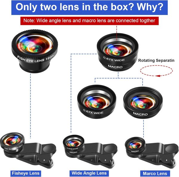 2 Pack Universal 3 in 1 Camera Lens Kit Phone Camera Lens Clip Fisheye Lens Macro Lens Wide Angle Lens Cell Phone Lens Attachments Compatible with Most Smartphones for Video, Live Show, Vlog